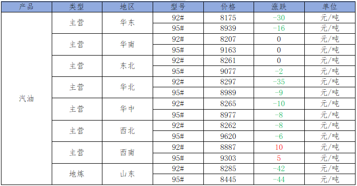 国内主营、地炼汽油价格