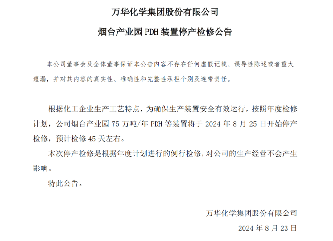 8月22日,万华化学发布公告表示,根据化工企业生产工艺特点,为确保生产装置安全有效运行,按照年度检修计划,公司烟台产业园园75万吨/年PDH等装置将于2024年8月25日开始停产检修,预计检修45天左右。本次停产检修是根据年度计划进行的例行检修,对公司的生产经营不会产生影响。