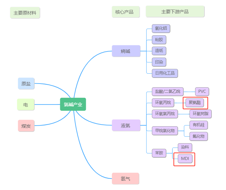 从上图可以看出,在氯碱产业链的下游产品中会涉及到聚氨酯、MDI等产品的应用。