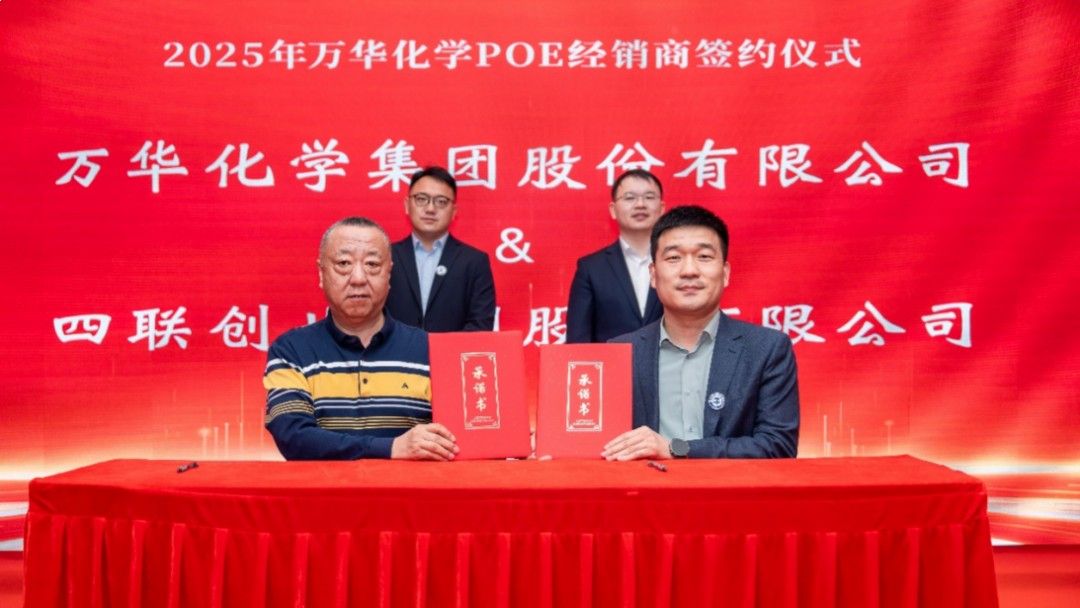 四联创业集团受邀出席大会,与万华化学签署《POE经销商合作协议》,双方就在市场拓展、技术服务及供应链优化等领域深化协作达成一致,助力POE产业链升级。