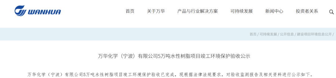 3月24日,万华化学官网发布,万华化学(宁波)有限公司5万吨水性树脂项目竣工环境保护验收已完成。