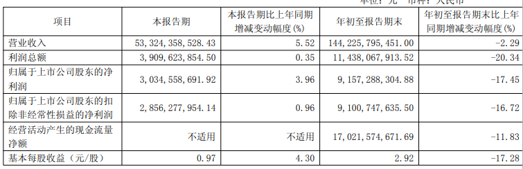万华化学第三季度实现营收533.24亿元,同比增长5.52%,这一数字刷新了公司单季度营收的历史纪录;净利润同步增长3.96%,达到30.35 亿元。