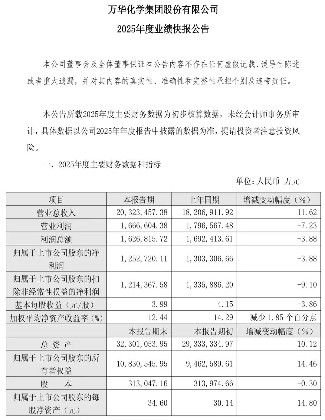 3月16日晚间,万华化学(600309.SH)发布2025年度业绩快报,递上一份喜忧参半的成绩单,营收首破2000亿元大关,净利润却仍延续下滑趋势。