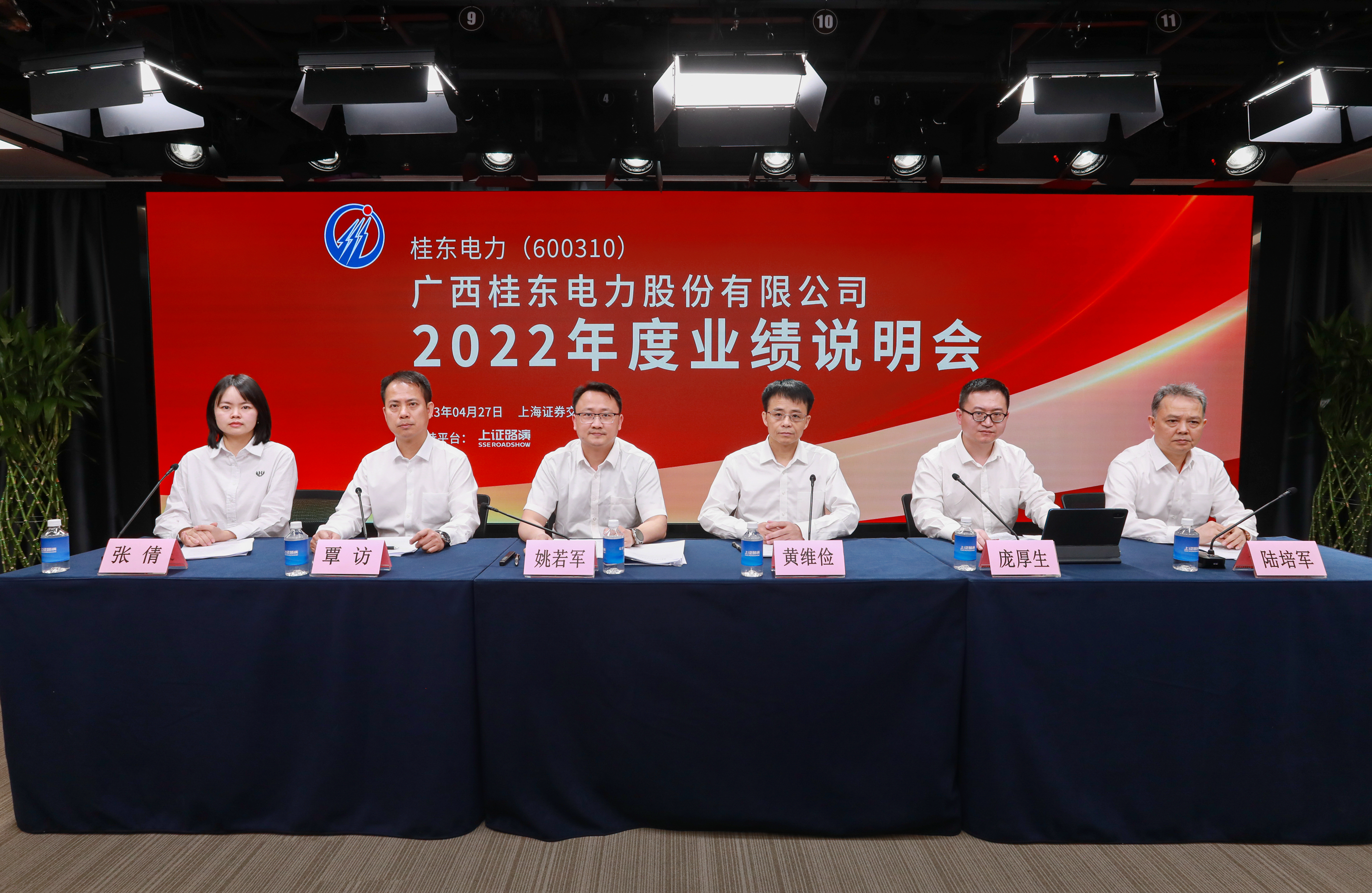 4月27日,广西桂东电力股份有限公司(以下简称:桂东电力)在上海证券大厦举办2022年度业绩说明会,董事长姚若军、总裁黄维俭、独立董事覃访、财务总监庞厚生、董事会秘书张倩、总裁助理陆培军等高管在业绩说明会现场为投资者介绍了公司2022年发展情况,投资者对公司新能源业务情况、股东回报、成本管控等方面较为关注,与会公司高管一一回答投资者关切。