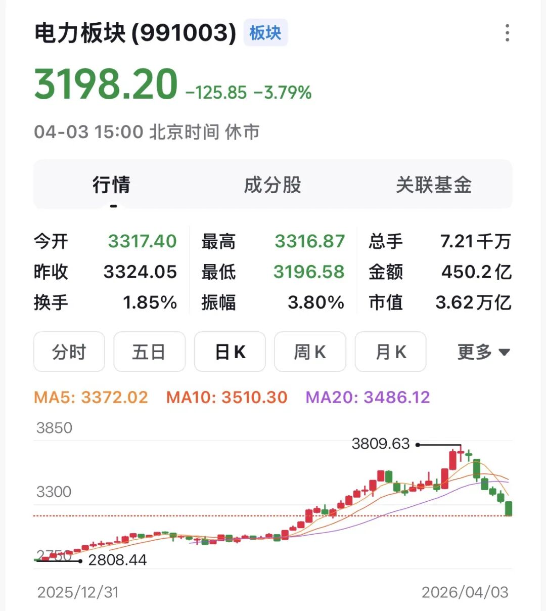 4月3日,整个电力板块迎来集体重挫。截至收盘,电力板块指数报3198.20点,单日大跌3.79%,全天指数下跌125.85点,板块整体成交450.2亿元,板块总市值3.62万亿。