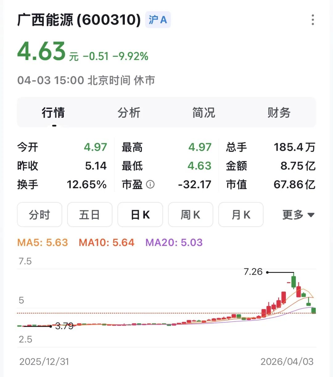 截至4月3日收盘,广西能源(600310)报4.63元,单日跌幅9.92%,封死跌停板。