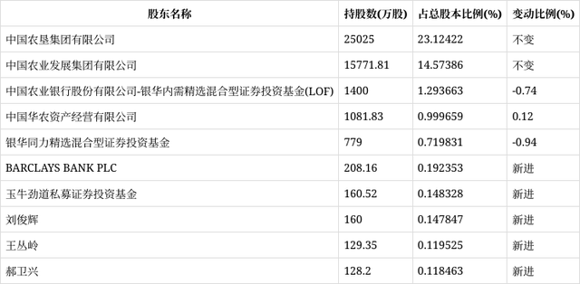 半年报显示,2022年上半年末的公司十大流通股东中,新进股东为BARCLAYS BANK PLC、玉牛劲道私募证券投资基金、刘俊辉、王丛岭、郝卫兴,取代了一季度末的银华农业产业股票型发起式证券投资基金、现代种业发展基金有限公司、阿拉丁农业有限公司、JPMORGAN CHASE BANK,NATIONAL ASSOCIATION、张铲棣。在具体持股比例上,中国华农资产经营有限公司持股有所上升,中国农业银行股份有限公司-银华内需精选混合型证券投资基金(LOF)、银华同力精选混合型证券投资基金持股有所下降。