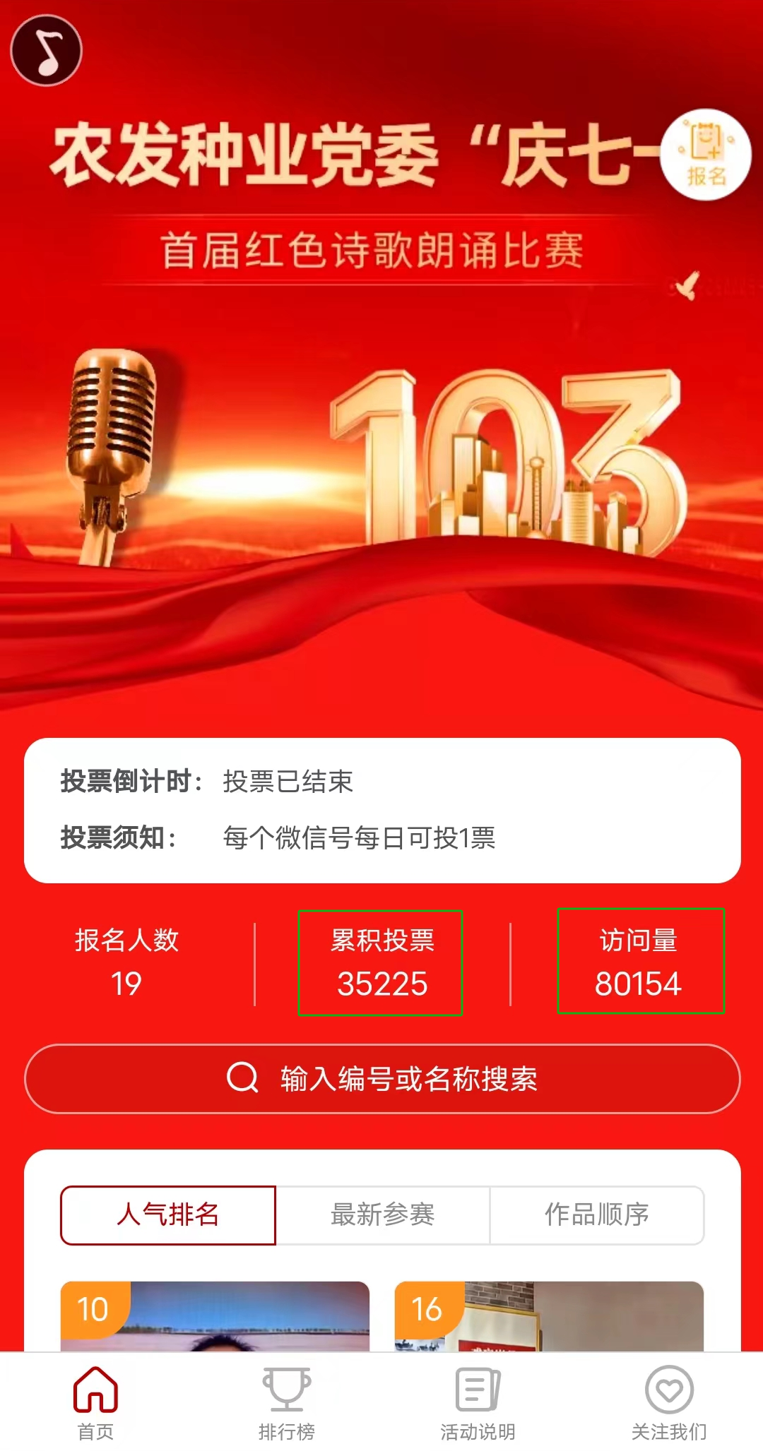 日前,农发种业党委启动以“庆七一”为主题的首届红色诗歌朗诵比赛。比赛开展以来,得到了广大党员干部职工积极参与,收到公司各级党组织报送的作品20余个,其中19个作品进入网络投票初赛。经27小时的初赛投票,赢得3万余总票数,网络访问量达8万,引起广泛关注。