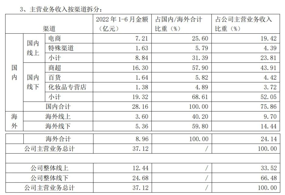 此外,从渠道上看,今年1-6月,上海家化线上业务受影响较大,业绩同比下降了23.4%,线下渠道业绩下降幅度为4%。具体来看,上半年,上海家化整体线上渠道营收为12.44亿元,占国内营收比例为33.52%;整体线下业务营收为24.68亿元,占国内营收占比为66.48%。