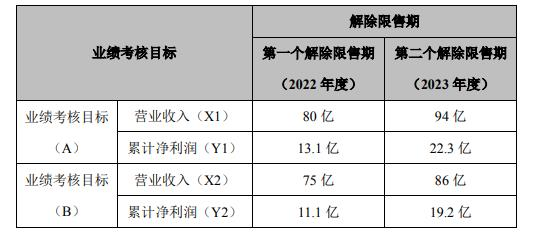 在业绩考核目标(B)中,对2022年的营收下调至75亿元(此前为96亿元),累计净利润下调至11.1亿元(未变);2023年营收下调至86亿元(此前为98亿元),累计净利润下调至19.2亿元(此前为21亿元)。