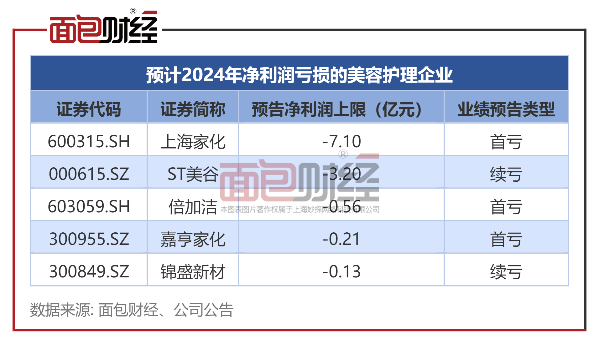 上海家化、ST美谷、倍加洁等5家企业预计2024年净利润亏损。