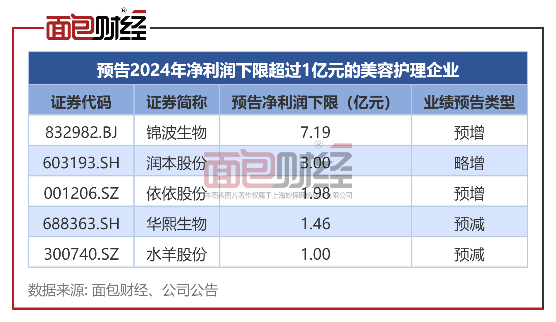公开资料显示,9家业绩预喜美容护理企业中,锦波生物、润本股份等5家企业预告净利润下限超过1亿元。