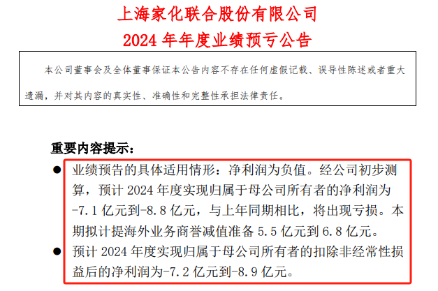 公告显示,上海家化预计2024年度实现归属于母公司所有者的净利润为亏损7.1亿元到8.8亿元,与上年同期(法定披露数据)相比,将出现亏损。本期拟计提海外业务商誉减值准备5.5亿元到6.8亿元。