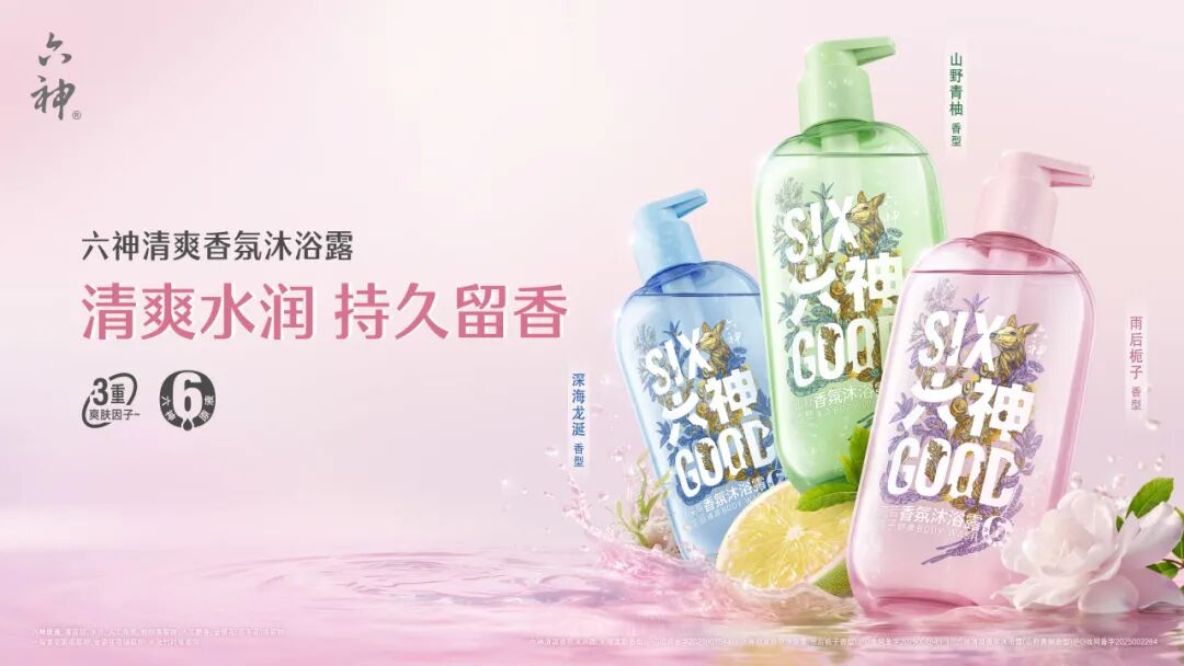 六神清爽香氛沐浴露系列,有深海龙涎、雨后栀子、山野青柚三款香型,24小时持久留香。