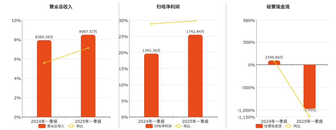 公司营业总收入为8987.57万元。归母净利润为1742.84万元。经营活动现金净流入为-2.45亿元,较去年同报告期经营活动现金净流入减少2.68亿元,同比较去年同期下降1143.07%。