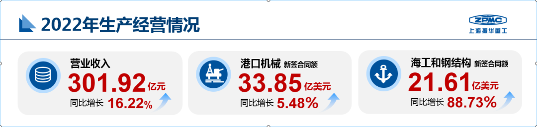 2022年,振华重工以“1544”总体发展思路和“十四五”发展规划为指引,坚持“稳中求进”的工作总基调,狠抓管理提升、降本增效和改革创新,保持了稳中向好的运营态势,全年主要任务目标全面完成。报告期内,公司实现营业收入301.92亿元人民币;港口机械业务新签合同额为33.85亿美元;海工和钢结构相关业务新签合同额为21.61亿美元。营业收入、新签合同额均创历史新高。同时,公司成本管控能力显著增强,财务健康水平持续提升,企业高质量发展走深走实。