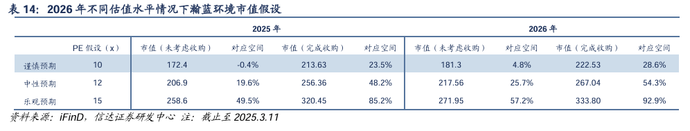 ?中性预期下,给予公司行业平均12倍PE估值,对应2026年瀚蓝环境目标市值217.56亿元,市场空间25.5%;若成功收购粤丰环保对应目标市值为267亿元,市场空间54.1%。