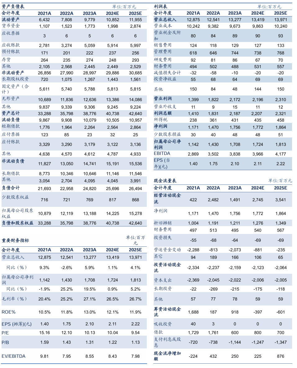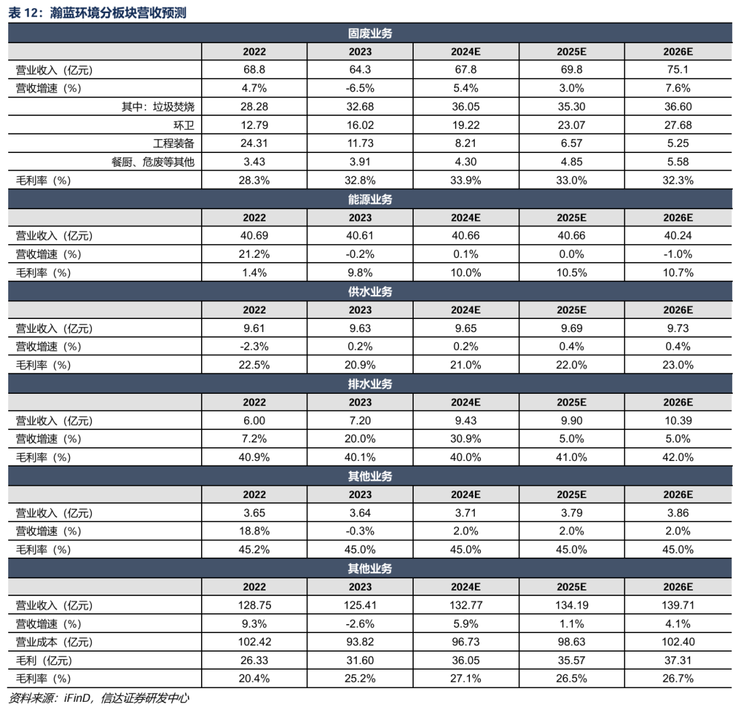 垃圾焚烧业务:根据公司披露的在建和筹建项目预计投产时间,我们预测2024-2026年垃圾焚烧在运产能为31250吨/日、31250吨/日、32000吨/日;考虑佛山市为人口流入地区,生活垃圾量或呈上升趋势,且公司近两年垃圾处理量保持增长,2023年产能利用率为119%,假设2024-2026年垃圾焚烧业务产能利用率保持高位,分别为120%、121%、122%。厂用电率由于效率提升而小幅下降,吨发电量、吨上网电量延续2023年水平。由于济宁项目补确认收入,公司预计2024年全年增厚营收15419万元,我们测算以后每年新增收入3700万元。工程装备业务:由于垃圾焚烧项目建造高峰期已过,我们预计24-26年业务营收增速为-30%、-20%、-20%。环卫和其他业务保持2023年的增长趋势。我们预计2024-2026年固废板块营收增速为5.4%、3%、7.6%,毛利率为33.9%、33%、32.3%。