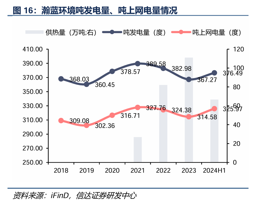 通过降低厂用电率拓展供热,积极提升运营管理效率。为了应对国补退坡的挑战,公司提高运营效率,开拓供热业务。(1)降本增效。厂用电率持续下降,从2018年16%下降到2024H1的13.4%;同时,产能利用率不断提高,从2021年97%提升至2024H1超过120%;(2)发展热电联产业务增加供热销售收入。公司利用垃圾焚烧发电项目的热源和区位优势,开拓管道供热和长距离移动供热项目,供热量自2021年以来持续增长。