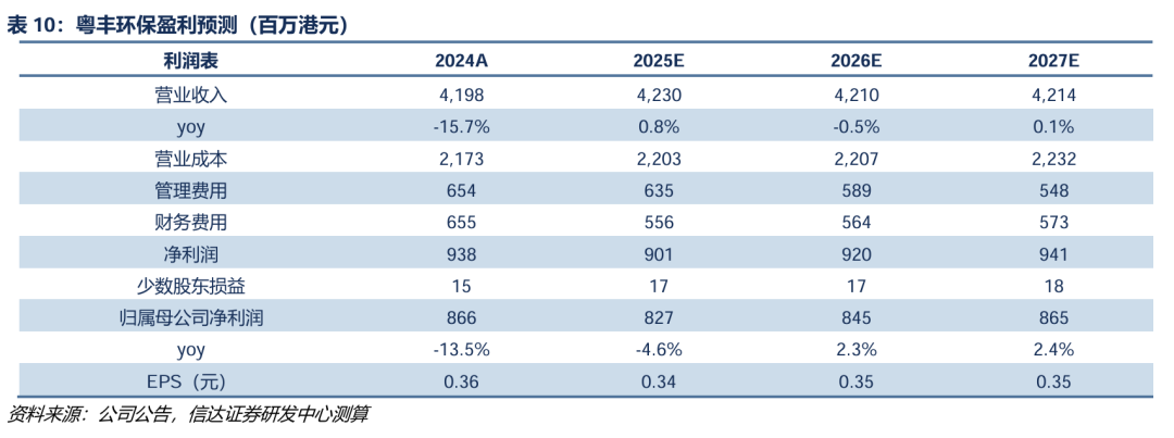 合并后瀚蓝环境拟持有粤丰环保52.45%股权。我们预计粤丰环保2025-2027年营业收入为42.3亿港元、42.1亿港元、42.14亿港元,增速分别为0.8%、-0.5%、0.1%;归母净利润为8.27亿港元、8.45亿港元、8.65亿港元(合人民币7.69亿元、7.86亿元、8.05亿元)。