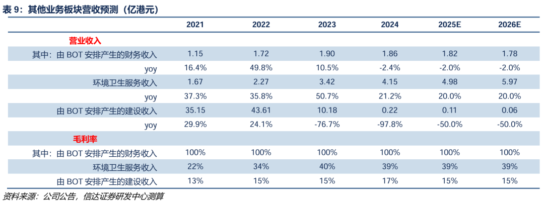 (1)由BOT产生的财务收入:2022-2024年板块营收增速为50%、11%、-2.4%,我们保守假设2025-2026年按每年收入增速-2%;