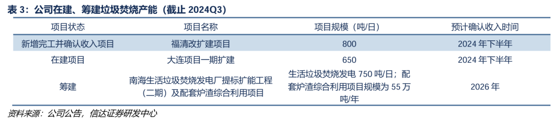 ??垃圾焚烧主业稳健运营,水务及能源业务贡献稳定现金流。截止2024Q3,公司垃圾焚烧发电在手项目规模3.58万吨/日,在运规模约3.1万吨/日。主要增长来自(1)降本增效,厂用电率下降及供热量提升保障盈利;(2)国内及海外项目投产短中期产能增加;(3)电费确认预计为24年增厚收入1.54亿元,以后每年增收3700万元。水务及能源业务现金流回款佳,或将受益于公用事业市场化改革推进。佛山市供水价格9年未调,存在上浮空间;燃气业务用户主要为工商业用户,调价相对顺畅,板块盈利已逐步趋稳。