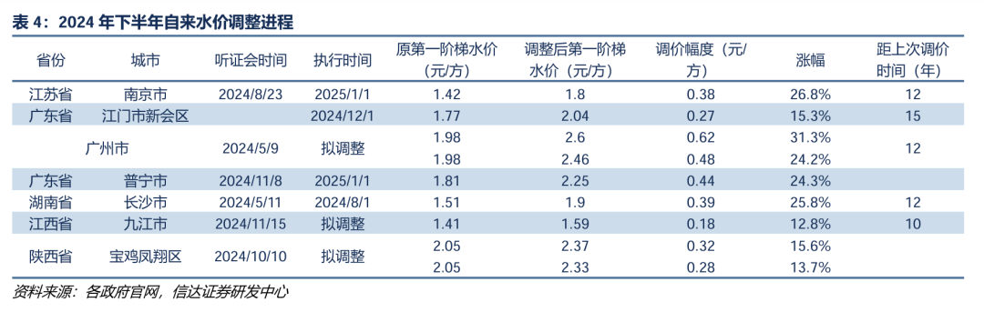 南海区水价9年未调,伴随水价市场化改革持续推进,水价存在上调可能。当前瀚蓝环境执行水价依据2016年2月印发的《南海区调整自来水价格实施方案》中规定的阶梯水价,至今已经有9年未调整。2024年下半年以来,广东多个城市推进水价调整,其中广东省广州市拟上调水价25%-30%、江门市新会区上调水价15.3%,普宁市上调水价24%,调整后价格均显著高于公司现行水价。佛山市南海区或存水价上涨空间,有望为公司带来盈利增厚。