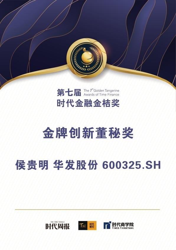 12月20日,以“新格局、新发展、新机遇”为主题,由广东时代传媒集团主办,时代周报、时代财经承办,时代商学院、时代数据提供技术支持的“第七届时代金融金桔奖”榜单重磅揭晓。本次评选中,凭借良好的经营业绩以及强劲的综合实力,华发股份成功从众多参选公司中脱颖而出,荣获“2022第七届时代金融金桔奖——高质量发展上市公司奖”荣誉。华发股份董事局秘书侯贵明先生凭借其在公司治理、信息披露、资本运作、投资者关系管理等一系列瞩目成绩,成功荣获“2022第七届时代金融金桔奖——金牌创新董秘奖”。