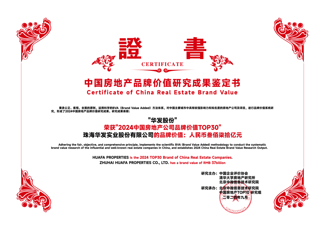 2024年9月13日,由中国企业评价协会、清华大学房地产研究所、北京中指信息技术研究院主办,北京中指信息技术研究院中国房地产TOP10研究组承办的“2024中国房地产品牌价值研究成果发布会暨第二十一届中国房地产品牌发展论坛”在雄安新区隆重召开。华发股份凭借雄厚的综合实力以及不断攀升的品牌价值,荣获“2024中国房地产公司品牌价值TOP30”,品牌价值高达370亿元人民币。