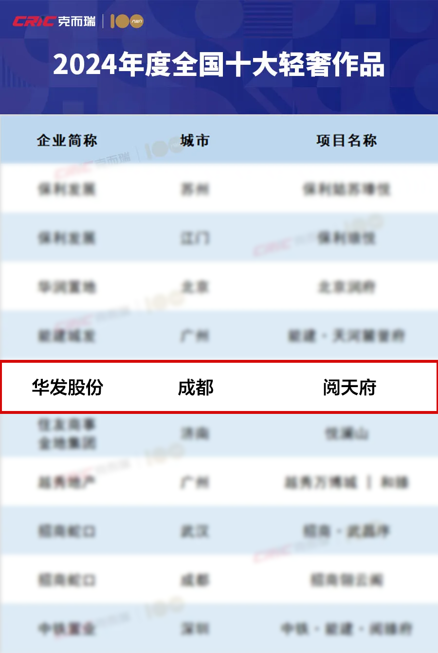 其中,珠海华发湾玺壹号、南京金陵月华荣登全国十大高端作品榜单,成都阅天府荣登全国十大轻奢作品榜单,上海华发时代之城荣登全国十大品质作品榜单,一举拿下2024“克而瑞全国十大作品”大满贯。