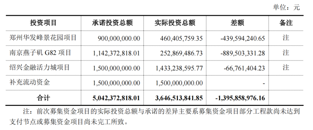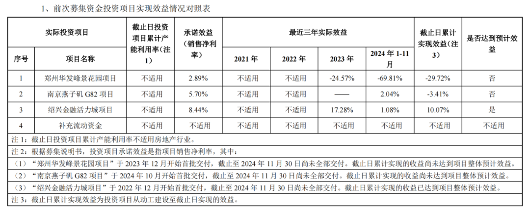 早在2023年,公司就已经募集51亿元资金投入房地产项目的建设中。但据报告书,首先是此前投入金额有约14亿元未使用。其次,三个项目中仅有一个项目达到预期收益。