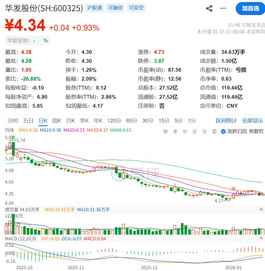 二级市场上,截至1月15日收盘,华发股份上涨0.93%报4.34元/股,总市值约119.44亿元,近一年来公司股价累计下跌约16%。