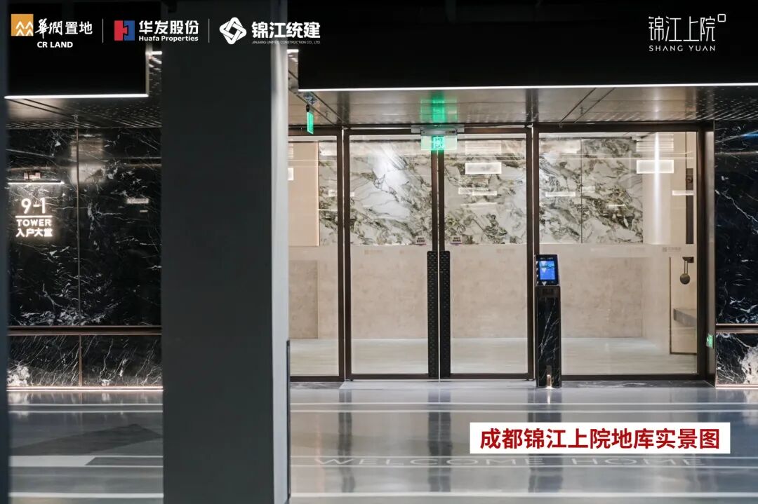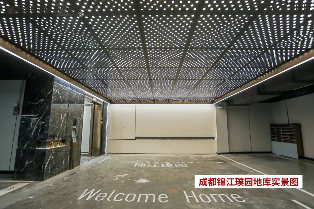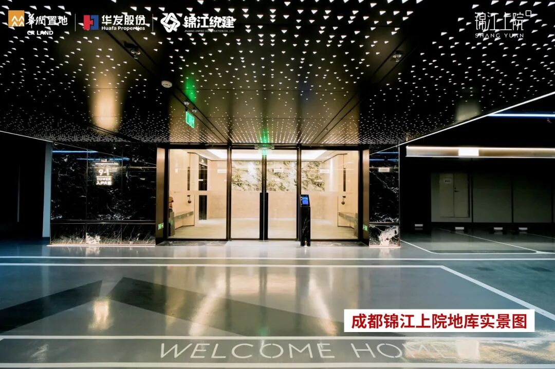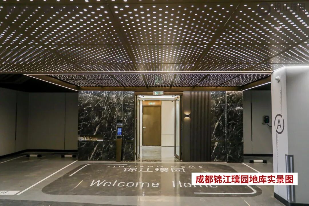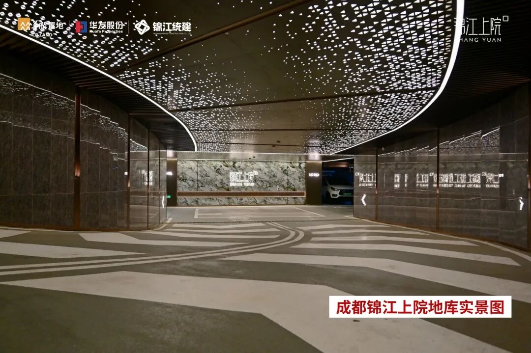 归家动线的细节,同样延续了这一产品思维。在成都华发锦江上院,从地库入口到地下大堂,穿孔铝板雕琢出星空肌理,艺术地面与穹顶星光相映,让归家成为一场沉浸的仪式。