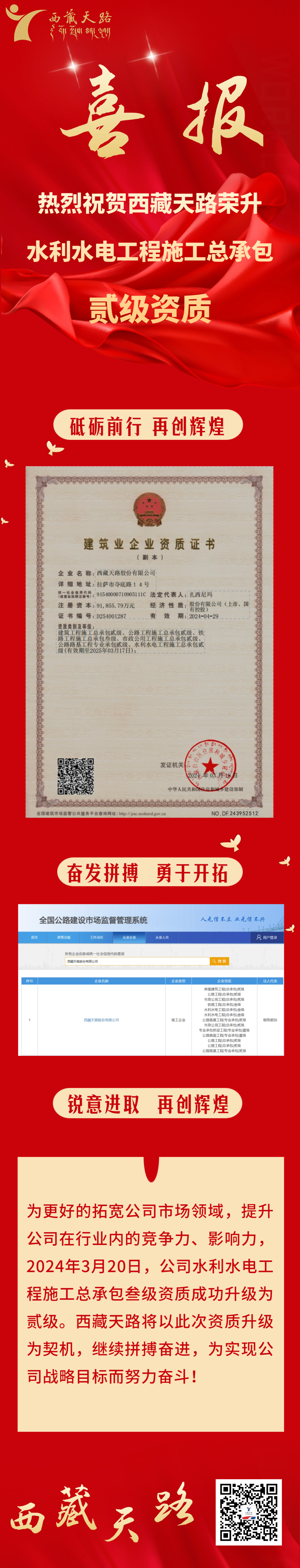 喜报!西藏天路荣升水利水电工程施工总承包贰级资质