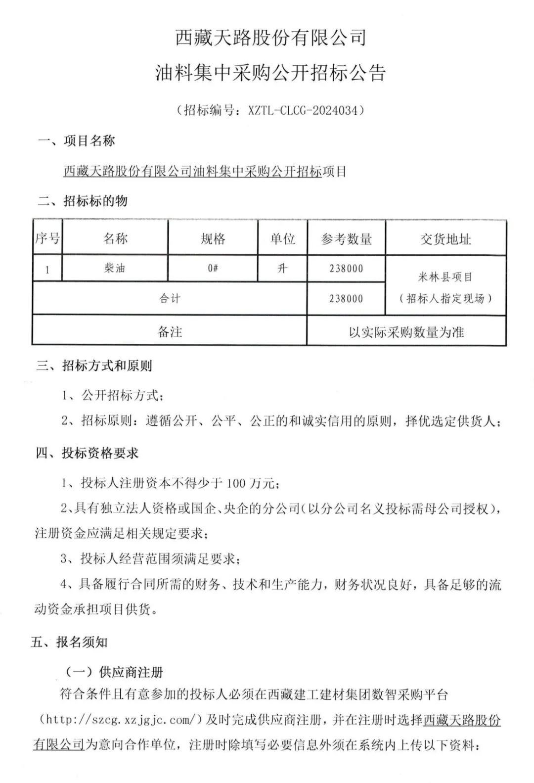招标公告丨西藏天路股份有限公司油料集中采购公开招标公告