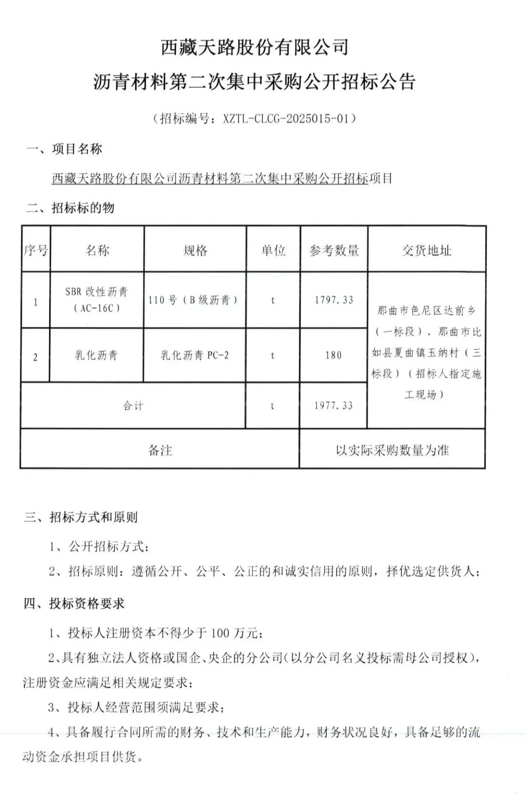 招标公告 | 西藏天路股份有限公司沥青材料第二次集中采购公开招标公告