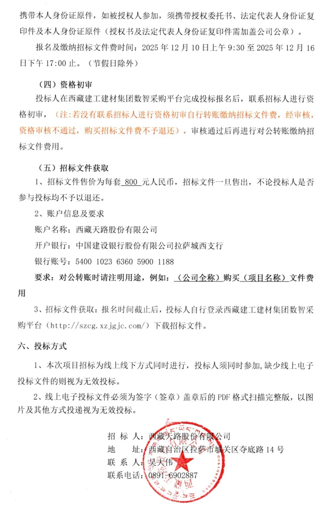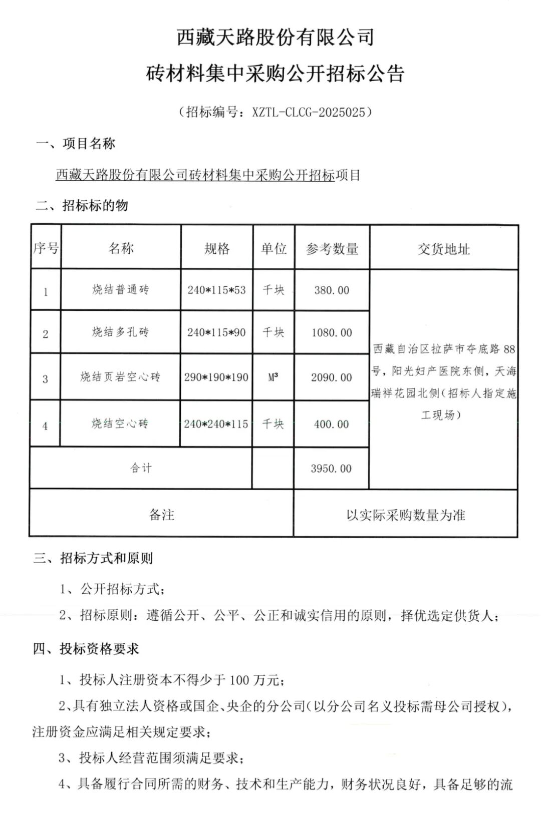招标公告 | 西藏天路股份有限公司砖材料集中采购公开招标公告