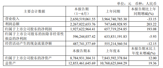 日前,达仁堂披露2025年半年度报告。报告期内,公司实现营业收入26.51亿元,同比下降33.15%;归属于上市公司股东的净利润为19.28亿元,同比增长193.08%。