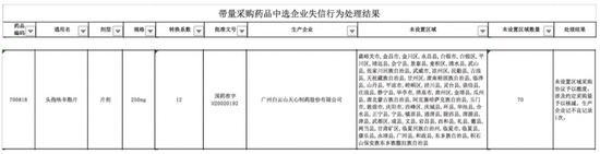 在上述的失信中选企业名单中,出现了白云山直接控股子公司天心制药的身影,其所生产的头孢呋辛酯片在部分区域未设置采购协议,且其未设置的区域数量多达70个,包括嘉峪关市、金昌市、永昌县、白银市等等。天心制药也因此被记不良记录1次。