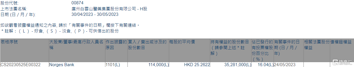 格隆汇5月30日丨根据联交所最新权益披露资料显示,2023年5月24日,白云山(00874.HK)获Norges Bank在场内以每股均价25.2622港元增持11.4万股,涉资约287.99万港元。