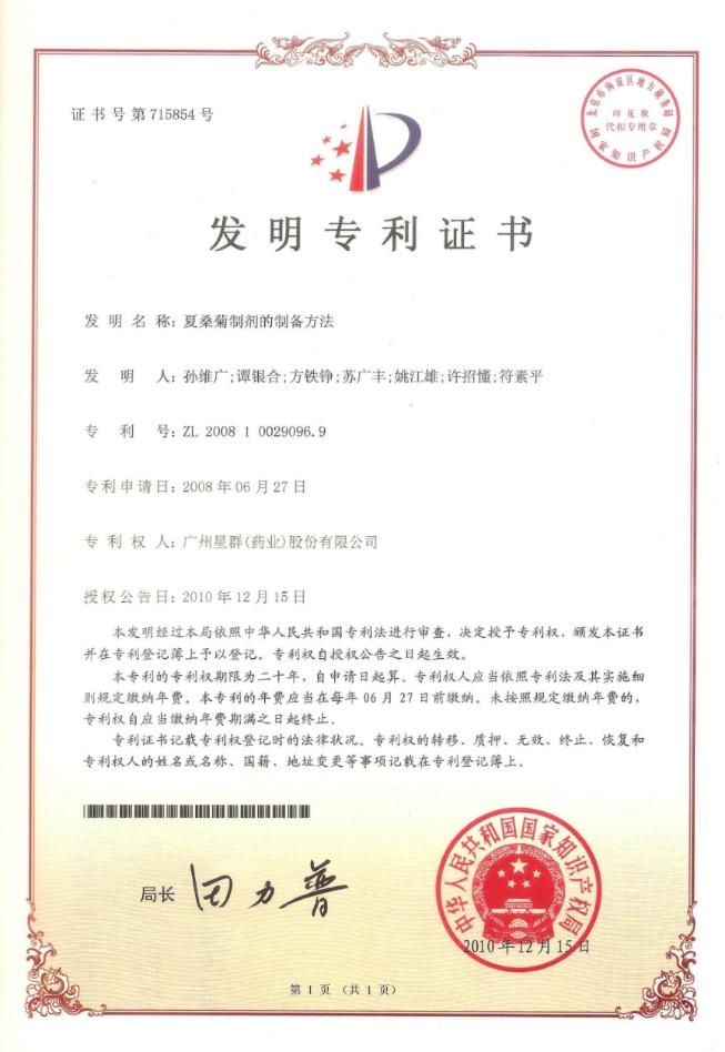在高质量发展驱动下,白云山星群交出靓丽成绩单——夏桑菊颗粒累计销售过百亿小包,深受市场欢迎;2006年,“传统手工技艺星群夏桑菊凉茶配方”经国务院批准,被列入“国家级非物质文化遗产”,成为老字号焕发新活力和供给侧结构性改革的典范;2016年,白云山星群凭“夏桑菊制剂的制备方法(专利号:ZL200810029096.9)”专利,首获中国专利优秀奖;2021年,白云山星群凭“一种抗流感病毒的中药有效部位及其制备方法(专利号:ZL 2006 1 0005382.2)”再获中国专利优秀奖;今年7月,白云山星群又以“一种阿法骨化醇软胶囊及其制备方法”专利,三捧中国专利优秀奖。白云山星群已累积获得30多项发明专利。