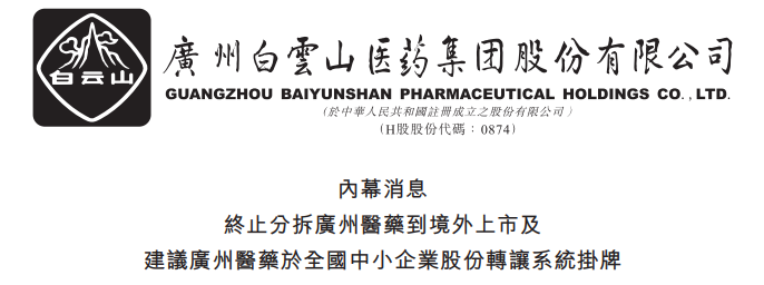 白云山公告称,自广州医药分拆上市方案公布以来,公司和广州医药董事会、管理层及相关中介机构一直共同积极推进各项工作。考虑到中国证监会出具的核准批复有效期已届满,且目前境内外资本市场环境发生变化,结合本公司及广州医药的战略规划,经审慎研究,决定终止推进广州医药发行境外上市外资股(H股)并上市相关工作。