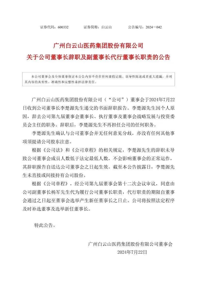 7月22日晚间,广州白云山医药集团股份有限公司发布公告称,公司董事会于2024年7月22日收到公司董事长李楚源先生递交的书面辞职报告。