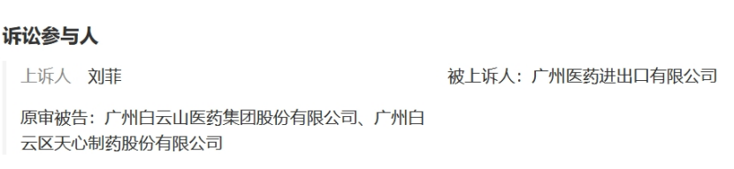 不过诉讼参与人的身份则有些奇怪:上诉人刘菲;被上诉人为广州医药进出口有限公司,原审被告为广州白云山医药集团股份有限公司、广州白云区(注:此处应为白云山)天心制药股份有限公司。