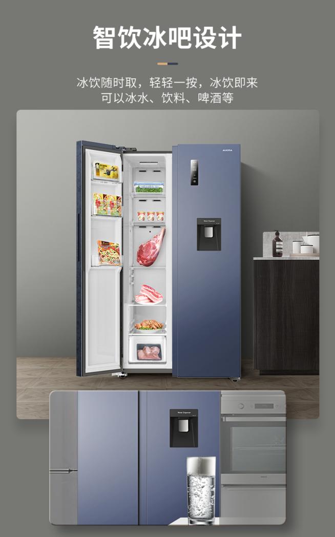 澳柯玛BCD-530WPHY(晶韵蓝)冰箱最大的特点就是具有饮水功能,为用户搭建了一个小型的家庭时尚水吧,随时随地轻松汲取清凉冰水,满足了人们在夏日中对冰饮的需求。它以饮水机的样式出现在冰箱门体上,出水口通过按压出水,而水箱内置于门体内侧,位于冷藏室,有2L的容量,温度0-10℃可调。水箱是可拆卸结构,可随时进行消毒清洗等。水箱进水口位置有专门密封装置,加水之后可关闭,防止食材与水之间串味。