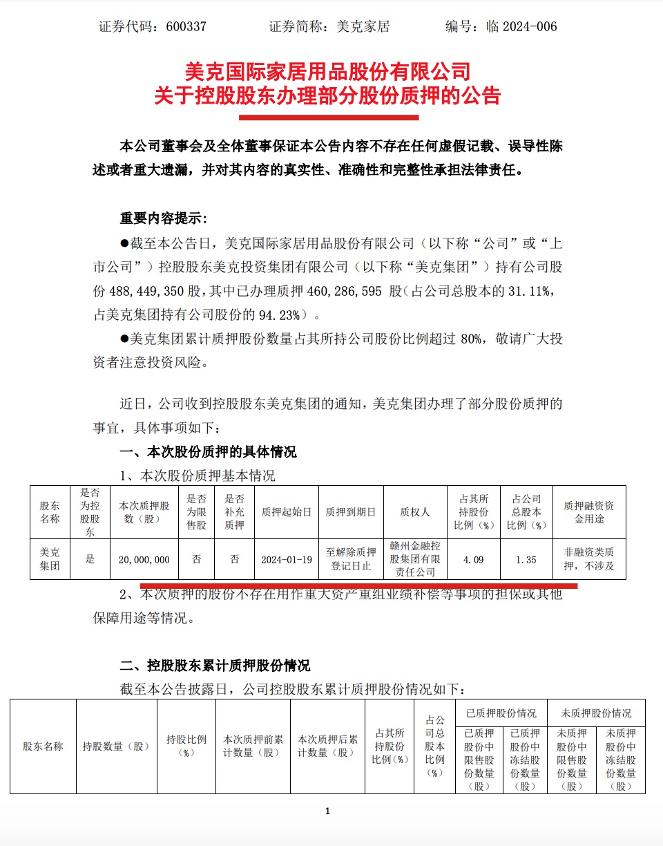 公告披露,美克家居控股股东美克集团持有公司股份4.88亿股,其中已办理质押的股份为4.6亿股,占公司总股本的31.11%,占美克集团持有公司股份的94.23%。