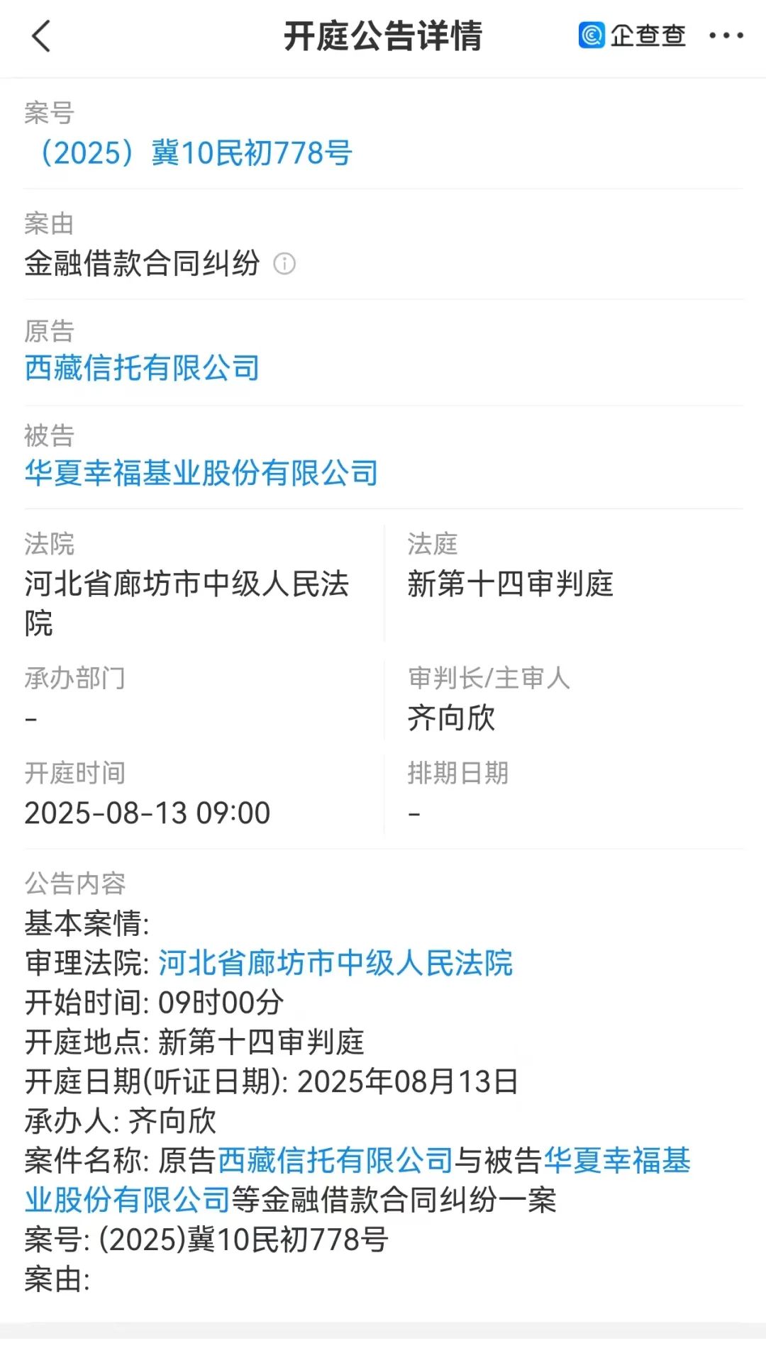 2025年8月13日,河北省廊坊市中级人民法院审理了一宗借款纠纷案,原告是西藏信托有限公司,被告则是深陷债务危机的华夏幸福基业股份有限公司。