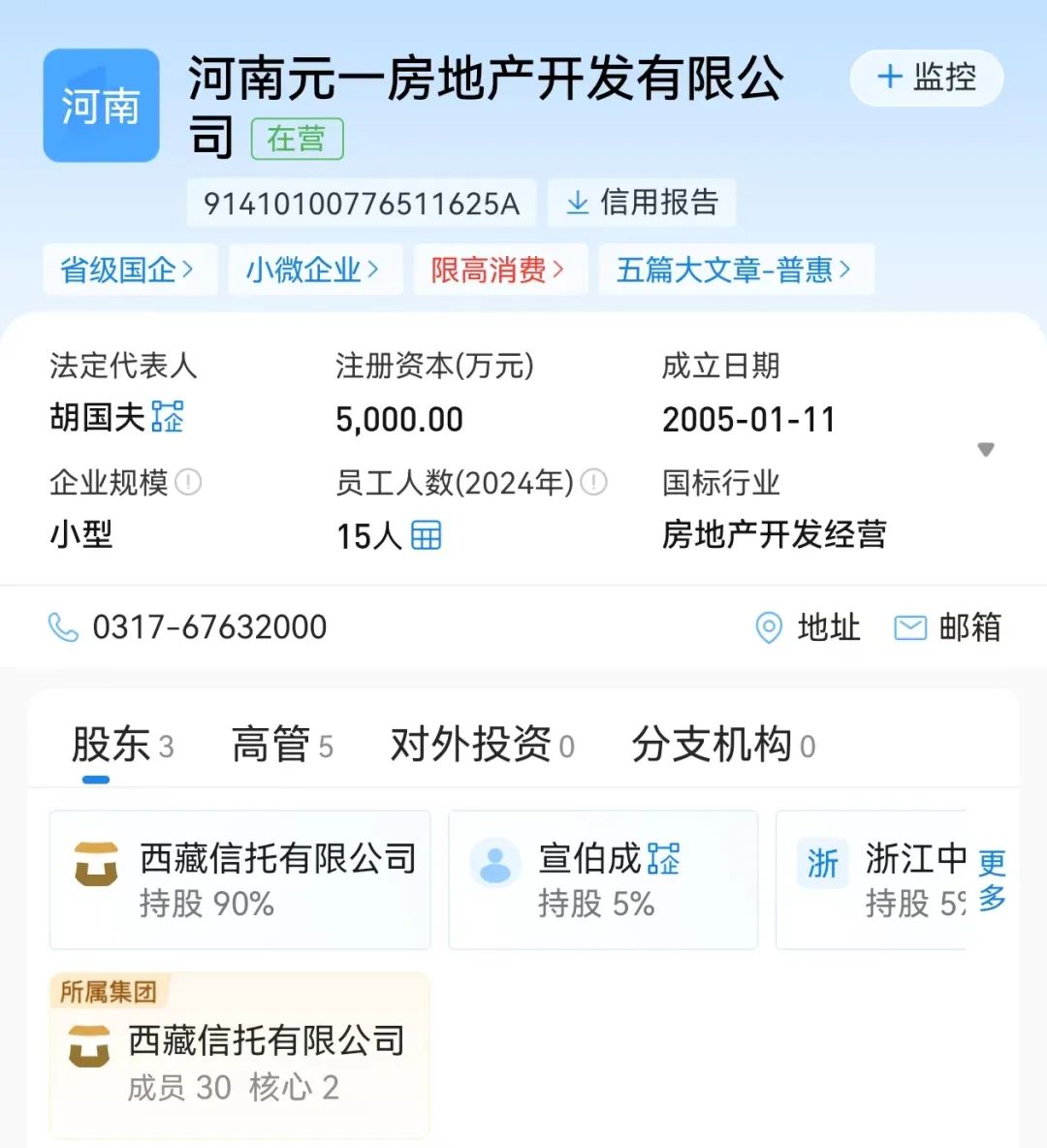 2024年底,西藏信托尝试打包出售包括河南元一、重庆金科在内的6.5亿元不良债权,但未曾见到出价方。目前,西藏信托是重庆金科的主要债权人之一,还是河南元一房地产控股股东,直接持股90%。