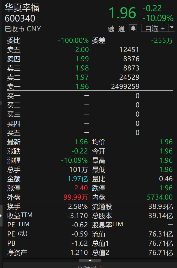 14日,华夏幸福在开盘后便牢牢封住跌停,直至收盘。