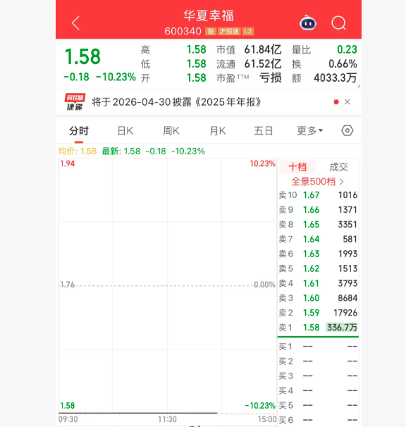 2026年1月16日,华夏幸福开盘继续跌停,报1.58元/股,截至13时57分,成交额4033.3万元,封单达336.7万手。